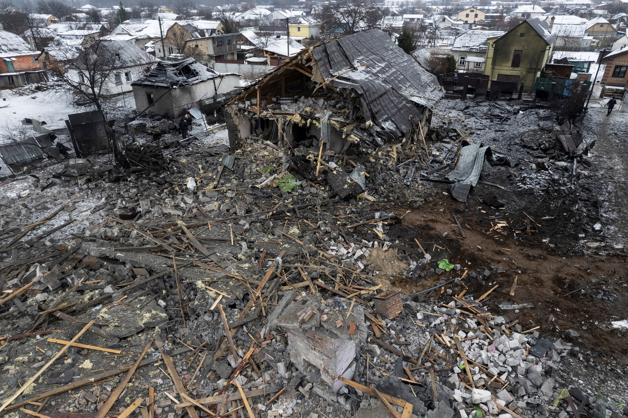 Một địa điểm gồm nhiều ngôi nhà dân cư ở thủ đô Kyiv của Ukraine bị hư hại nặng sau một cuộc tấn công bằng tên lửa
