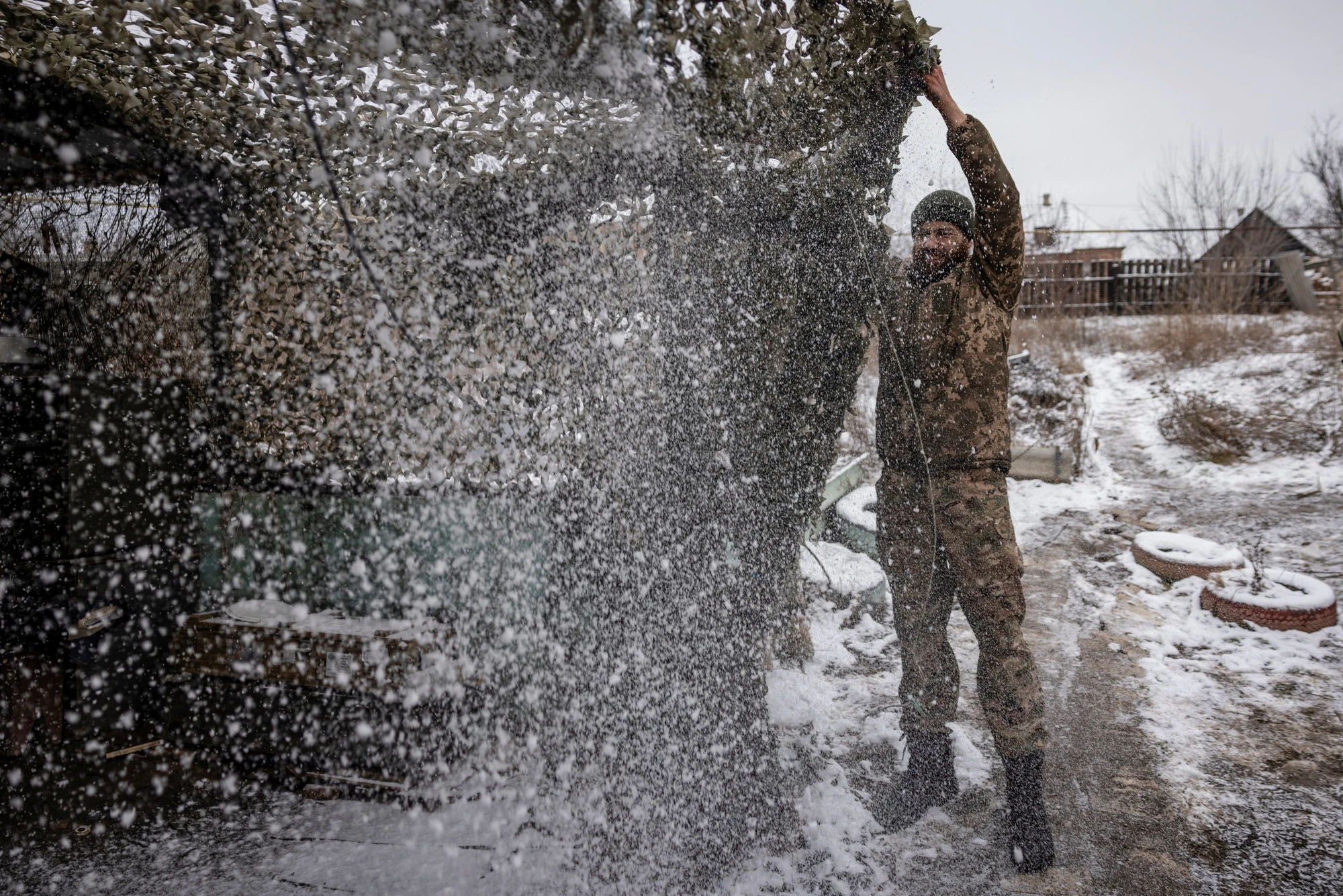 Một quân nhân Ukraine thuộc lữ đoàn cơ giới số 93 đang rũ tuyết khỏi lưới ngụy trang gần tiền tuyến ở tỉnh Donetsk hôm 25.12