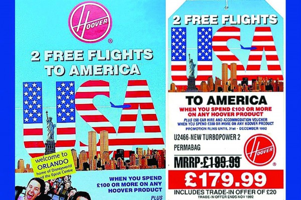 Bây giờ, với một hóa đơn mua hàng Hoover trị giá tối thiểu 100 Bảng Anh, khách sẽ có được một gói du lịch Mỹ trị giá 600 Bảng Anh (hay 1.355 USD ngày nay).
