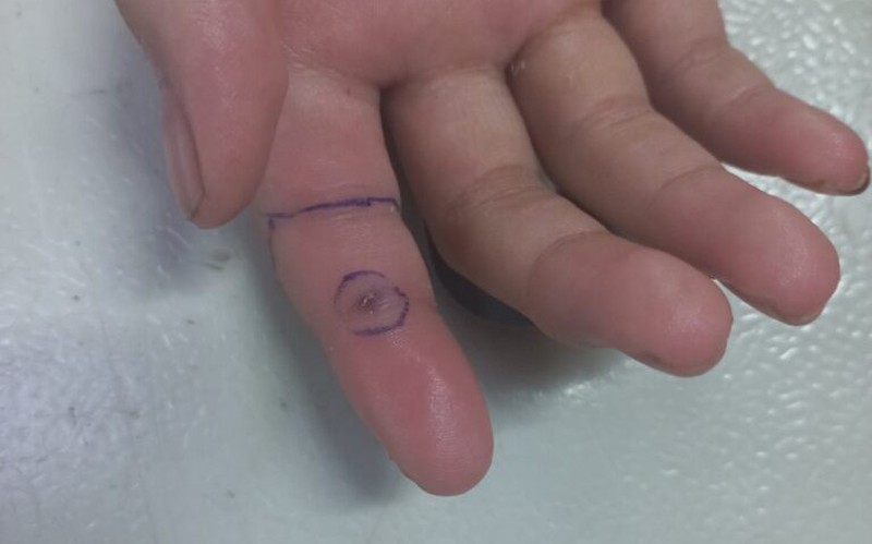 Qua thăm khám, 2 bệnh nhi vẫn tỉnh táo, tuy nhiên xuất hiện đau nhức ngón tay và sưng nề bàn tay phải (nơi bị rắn cắn). Cùng với vật chứng được gia đình cung cấp, các bác sĩ đã đưa ra chẩn đoán: Rắn hổ mang cắn giờ thứ 3.