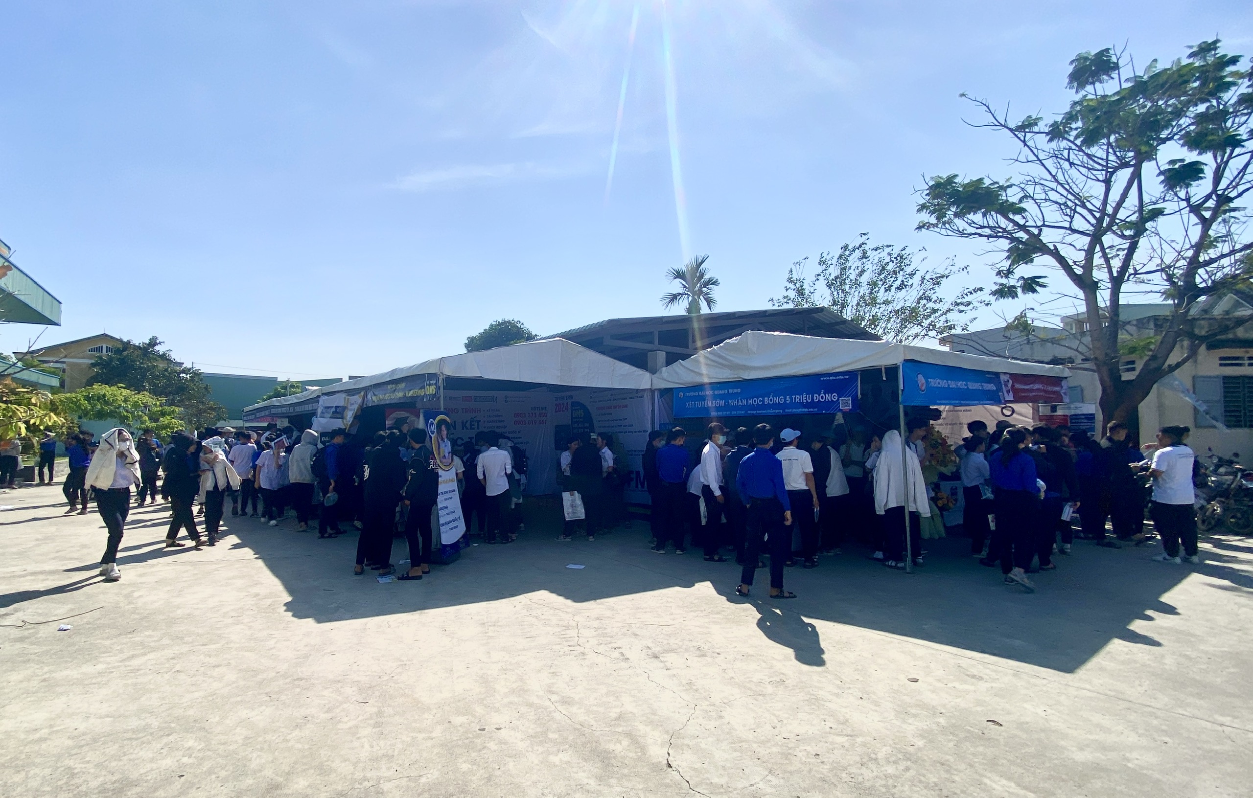 Ngoài tư vấn trong hội trường, các trường ĐH còn đặt gian hàng ở phía bên ngoài để thuận tiện cho học sinh đến tham quan, đăng ký, nghe tư vấn những thắc mắc về ngành học…