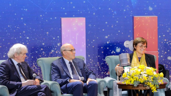 Các chủ nhân giải thưởng VinFuture mùa giải đầu tiên trong cuộc giao lưu “Chào tương lai”. Từ trái sang: GS Pieter Cullis, GS Drew Weissman, GS Katalin Kariko.