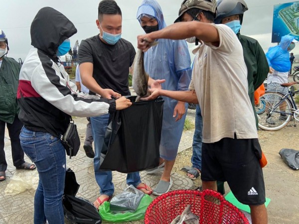 Người dân tập trung mua cá hỗ trợ chủ lồng bè tại vịnh Mân Quang (Q.Sơn Trà, TP.Đà Nẵng) |