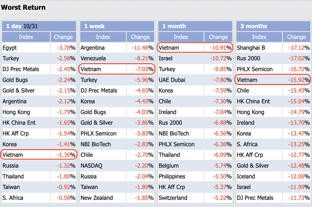 Chứng khoán Việt Nam trở thành một trong những thị trường có diễn biến tồi tệ nhất trên thế giới. Thống kê của trang Stockq cho thấy, trong tuần cuối cùng của tháng 10, VN-Index giảm hơn 7%, giảm mạnh thứ 3 thế giới và là thị trường giảm mạnh nhất thế giới trong tháng 10.