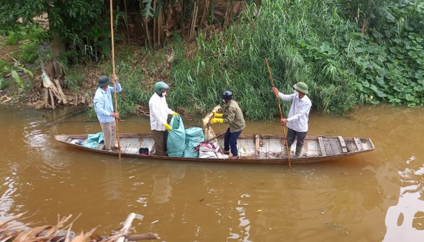 Người dân xã Liên Thủy chèo đò vớt rác tại khu vực ô nhiễm