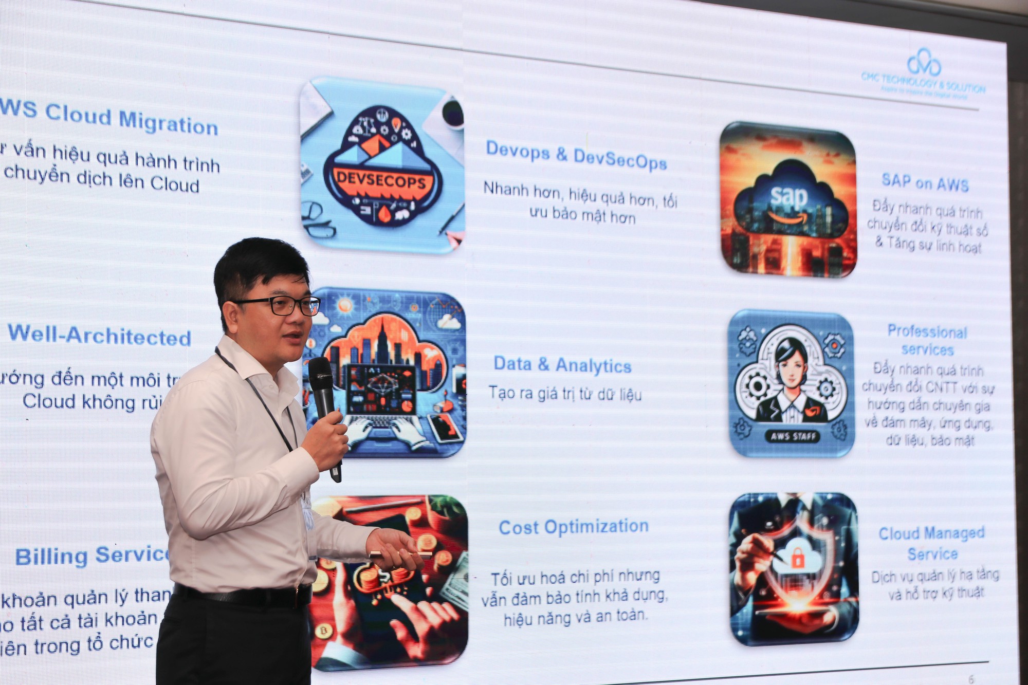 Trong buổi hội thảo, ông Nguyễn Hoàng Sơn – Solution Sales của CMC TS – cũng chia sẻ thêm, CMC TS hiện đang là đối tác cấp cao của AWS (Advanced Tier Services Partner) tại thị trường Việt Nam. Năm 2023, CMC TS chính thức hoàn thành chương trình Migration Competency Readiness (MCR), khởi đầu cho quá trình đánh giá năng lực của đối tác để đạt chứng nhận Migration Competency Program (MCP), chứng tỏ năng lực chuyên môn toàn cầu về di chuyển hạ tầng cơ sở của khách hàng lên AWS.CMC TS đang cung cấp 9 dịch vụ giải pháp của AWS bao gồm: Cloud Migration, DevOps & DevSecOps, Data Warehouse & Data Analytics, Well – Architected, SAP on AWS, Billing Service, Cost Optimization, Profession Services và Cloud Managed Service. Với Cloud Migration, CMC TS sẽ đồng hành cùng doanh nghiệp từ giai đoạn bắt đầu, tư vấn chuyển đổi workload đến triển khai thiết kế hạ tầng giải pháp, bàn giao quản trị hệ thống cũng như kiến thức kinh nghiệm cho bộ phận IT của khách hàng vận hành hiệu quả nhất.