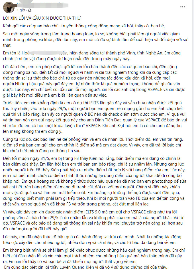 Bài chia sẻ, cầu xin sự tha thứ của “cô gái 9.0 IELTS”