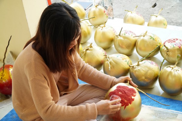 Năm nay, ảnh hưởng dịch Covid-19, các trường nghỉ tết muộn nên cô giáo Huỳnh Ngọc Quyến (29 tuổi, giáo viên mỹ thuật Trường tiểu học Tân Long A, xã Tân Long, H.Mang Thít, Vĩnh Long) phải vừa dạy học trực tuyến cho học sinh vừa nhận vẽ dừa chưng tết cho khách vào buổi trưa và buổi tối. Tuy vất vả nhưng thỏa được niềm đam mê và có thêm thu nhập. “Mọi năm nghỉ tết sớm, tôi thuê một lô ở chợ hoa xuân ở TP.Vĩnh Long để vẽ dừa và các loại quả cho người dân về chưng tết. Năm nay, ảnh hưởng dịch Covid-19, các trường nghỉ tết muộn nên tôi chỉ nhận đặt hàng trực tuyến và vẽ vào giờ rảnh, cũng không dám nhận nhiều vì sợ không làm kịp”, cô nói.