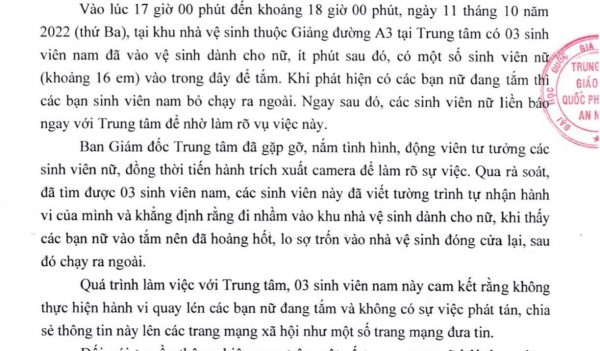 “Quá trình làm việc với trung tâm, 3 sinh viên nam này cam kết rằng không thực hiện hành vi quay lén các bạn nữ đang tắm và không có sự việc phát tán, chia sẻ thông tin này lên các trang mạng xã hội như một số trang mạng đưa tin”, văn bản nêu rõ.