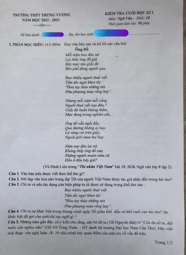 Trao đổi với phóng viên Báo Thanh Niên, cô Nguyễn Trần Hạnh Nguyên, Tổ trưởng tổ ngữ văn Trường THPT Trưng Vương, cho biết kỳ kiểm tra diễn ra vào thời điểm cận tết nên tổ ngữ văn lựa chọn chủ đề ngày tết với mong muốn học sinh lớp 10 có tâm lý thoải mái vì gần gũi, quen thuộc và các em có không gian sáng tạo trong bài làm của mình. Theo cô Hạnh Nguyên, tổ ngữ văn đã thống nhất chọn ngữ liệu là bài thơ Ông Đồ và yêu cầu nghị luận về ngày tết truyền thống.