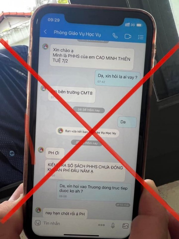 Mới đây, vào cuối tháng 9, phụ huynh học sinh Trường THCS Cách Mạng Tháng Tám (Q.10, TP.HCM) nhận được tin nhắn qua ứng dụng Zalo từ một tài khoản mang tên Phòng Giáo vụ học vụ có logo trường với nội dung: “Kiểm tra sổ sách phụ huynh học sinh chưa đóng khoản phí đầu năm, nay là hạn chót và yêu cầu phụ huynh đóng gấp qua tài khoản cá nhân”.