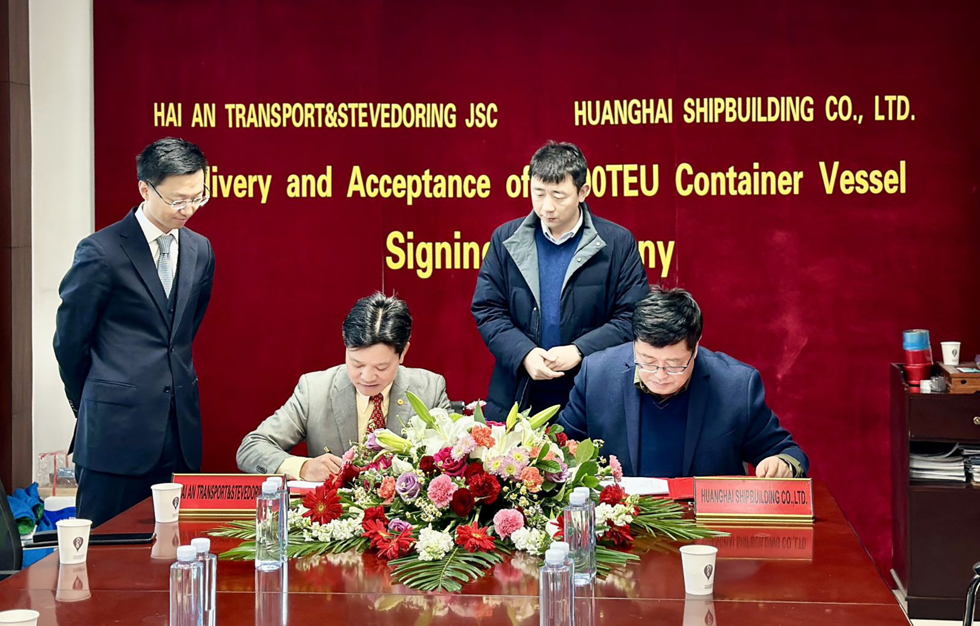 Ông Vũ Thanh Hải – Chủ tịch HĐQT Công ty CP Vận tải và Xếp dỡ Hải An và ông Chang – Phó Chủ tịch HĐQT nhà máy đóng tàu Hoàng Hải ký biên bản giao nhận tàu HAIAN ALFA tại Trung Quốc, ngày 15.12.2023