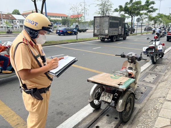 Lúc 10 giờ 20 cùng ngày, CSGT tuần tra trên đường Võ Văn Kiệt, hướng đi quốc lộ 1. Khi vừa qua đoạn giao giữa đường Võ Văn Kiệt – Hải Thượng Lãn Ông (P.10, Q.5) thì phát hiện anh L.C.H (28 tuổi, ngụ Q.8) chạy xe máy biển số 59G2-040.xx có dấu hiệu độ chế, thay đổi kết cấu thành xe 3 bánh chở hàng, nên yêu cầu dừng xe kiểm tra.