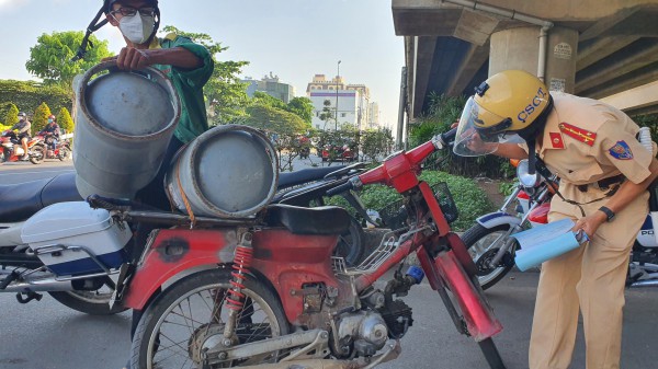 Đến khoảng 8 giờ 15 phút, anh N.H.K.N (20 tuổi, quê Ninh Thuận) chạy xe máy “cà tàng” chở 2 bình gas đi giao cho khách, bị CSGT ra lệnh dừng xe kiểm tra hành chính.