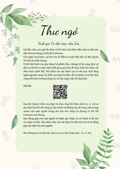 Ngày 30-07-2023, tại tòa nhà Iris, chung cư Hà Đô Centrosa, sẽ diễn ra cuộc họp bầu cử Ban Quản Trị cho tòa nhà chung