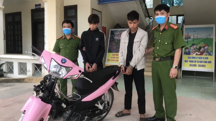 Theo đó, vào sáng ngày 3/5, tổ công tác Công an các xã Nghi Công Nam và Nghi Công Bắc, huyện Nghi Lộc, Nghệ An phát hiện 2 nam thanh niên cùng trú tại huyện Nghi Lộc gồm Nguyễn Quốc Đăng (SN 2004, trú tại xã Nghi Đồng) và Nguyễn Đình Sâm (SN 2003, trú tại xã Nghi Hưng) vào một cửa hàng mua bán điện thoại tại xã Nghi Công Nam với nhiều biểu hiện nghi vấn.