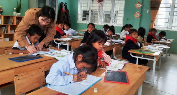 Cô Hồ Thị Xuân cầm tay học sinh dạy viết chữ |