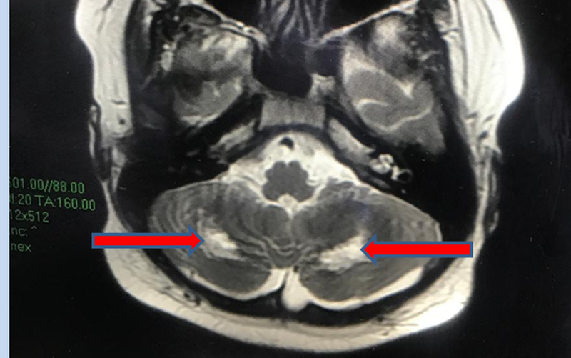 Tuy nhiên, đến tuần thứ 3, bệnh nhi sốt lại, đỏ mắt, đỏ da, có biểu hiện rối loạn phối hợp vận động, xét nghiệm phản ứng viêm trong máu tăng cao trở lại. Các bác sĩ tiến hành chọc dò dịch não tủy xét nghiệm bình thường và chụp MRI não, ghi nhận tổn thương đồi thị hai bên, tổn thương chất trắng của tiểu não.