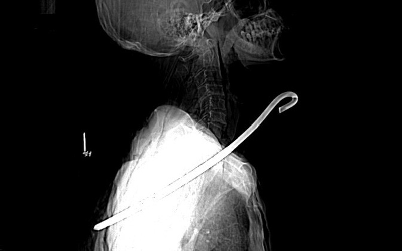 Kết quả chụp CTScan cho thấy, dị vật kim loại đường kính 0,8cm, dài khoảng 30cm, xuyên từ vùng cổ phải qua phổi phải và trung thất xuống vùng ngực bên trái; tổn thương rách thùy trên phổi phải, tràn khí màng phổi trái, tràn khí dưới da thành ngực và vùng cổ; gãy cung sau xương sườn số 5, 6 bên trái, gãy xương bả vai trái…