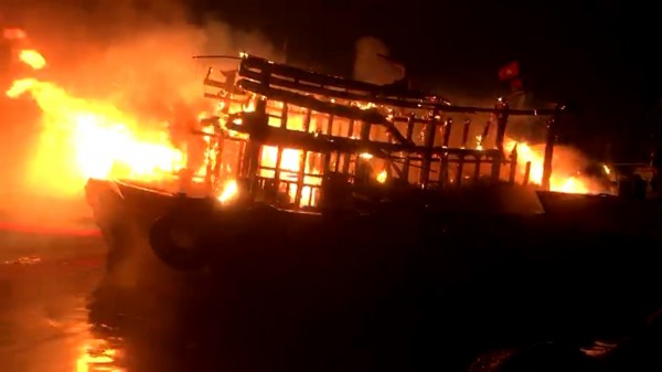 Vì tàu cá bốc cháy đang neo đậu cách xa bờ nên người dân địa phương khi phát hiện sự cố không thể tiếp cận dập lửa, liền gọi điện báo lực lượng chức năng.