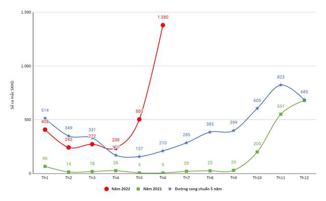 Biểu đồ phân bố số ca mắc sốt xuất huyết theo tháng năm 2022 so với cùng kỳ và so với đường cong chuẩn 5 năm gần nhất (Ảnh: Trung tâm kiểm soát bệnh tật Đà Nẵng).