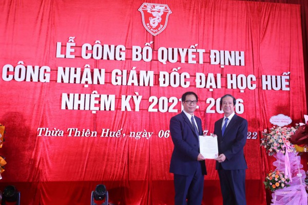 Ngày 6.7, tại TP.Huế (Thừa Thiên-Huế) Đại học (ĐH) Huế tổ chức lễ công bố quyết định công nhận Giám đốc ĐH Huế nhiệm kỳ 2021-2026. PGS-TS Nguyễn Kim Sơn, Bộ trưởng Bộ GD-ĐT, đã đến dự và trao quyết định.