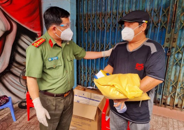 Đại tá Đinh Văn Nơi trao quà hỗ trợ cho người dân bị ảnh hưởng do dịch Covid-19