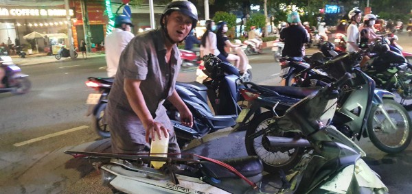 Trong khi anh Hoàng Trường Giang đang đổ bon xăng 1 lít vừa mua được vào xe, thì người phụ nữ áo vàng đứng canh chờ mượn bon
