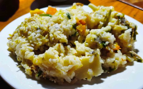Xúc ít cháo, anh Hết mời tôi nếm thử. Trước mắt tôi là phần cháo với màu sắc vui mắt. Có màu vàng của bí, xanh thẫm của rau rừng, thoảng vị hăng nhẹ của măng quyện cùng cái bùi của gạo và cái đậm của cá suối.