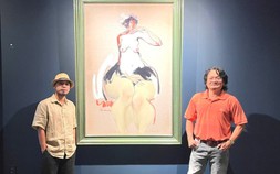 Họa sĩ Tứ Rô (trái) và giám tuyển Lý Đợi tại triển lãm Sắc thân