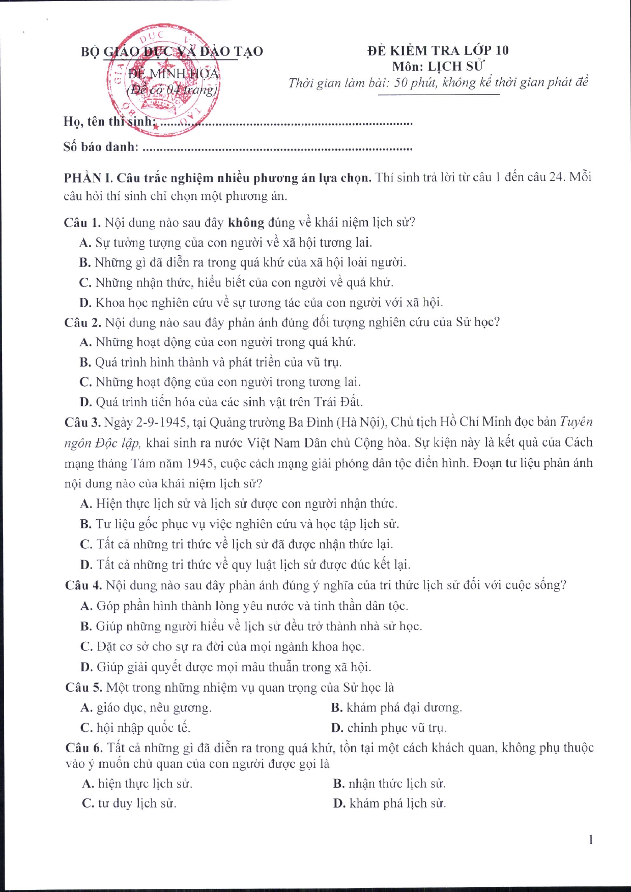 Đề thi minh họa môn lịch sử được chia làm hai phần: