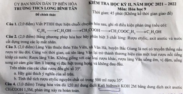 Trong kỳ thi học kỳ 2 vừa diễn ra, trong đề thi môn hóa học lớp 9, Trường THCS Long Bình Tân (TP.Biên Hòa, Đồng Nai) đưa rượu Làng Vân vào đề thi. Điều này khiến nhiều phụ huynh đã phản ứng.