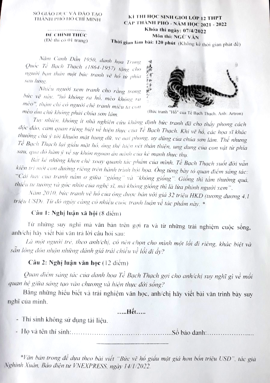 Từ câu chuyện bức vẽ hổ từ phía sau lưng của danh họa Trung Quốc Tề Bạch Thạch với ý kiến khen chê trái chiều của người xem, và bằng trải nghiệm cuộc sống của bản thân, đề yêu cầu thí sinh: “…Có nên chọn cho mình một lối đi riêng, khác biệt và sẵn lòng đón nhận những đánh giá trái chiều về lối đi ấy?”, (câu nghị luận xã hội, 8 điểm).