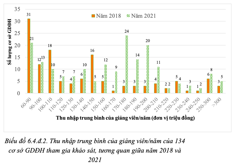 Nếu năm 2018, tỷ lệ giảng viên thu nhập dưới 100 triệu/năm chiếm 26,2% thì năm 2021 chỉ còn 12,7%; năm 2018 tỷ lệ giảng viên thu nhập dưới 150 triệu/năm là 57,5% thì năm 2021 con số này giảm xuống còn 46,3%/ năm.