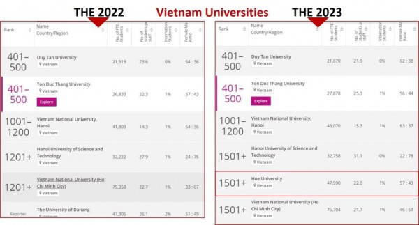 Việt Nam có 6 cơ sở giáo dục ĐH được xếp hạng trong bảng xếp hạng ĐH thế giới THE 2023, trong đó 5 đơn vị (Trường ĐH Duy Tân, Trường ĐH Tôn Đức Thắng, ĐH Quốc gia Hà Nội, ĐH Quốc gia TP. HCM và Trường ĐH Bách khoa Hà Nội) đã có từ THE 2022, ĐH Huế là đơn vị mới.