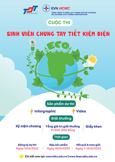 Thời gian đăng ký dự thi từ 15/04/2022-30/04/2022. Đăng ký online tại: https://bom.so/dangkyduthiTKD. Đối tượng tham gia là sinh viên trường Đại học Tôn Đức Thắng. Sản phẩm dự thi: infographic, video (thời lượng tối đa 3 phút). Sinh viên có thể thực hiện theo nhóm hoặc cá nhân.Tiêu chí chấm: Thông điệp tiết kiệm điện; Vui tươi, hài hước; Tính sáng tạo, độc đáo; Khuyến khích sử dụng hình ảnh liên quan mô hình làm tư liệu. Ban giám khảo chấm điểm để chọn 20 sản phẩm infographic và 20 video xuất sắc nhất để thực hiện bình chọn trực tuyến: 03 – 17/5/2022. Bình chọn trực tuyến trên fanpage Đại học Tôn Đức Thắng để chọn ra các sản phẩm dự thi có lượt tương tác cao nhất: 18 – 31/5/2022. Sản phẩm đạt giải là sản phẩm có điểm Ban giám khảo và điểm bình chọn trực tuyến cao nhất (60% tỷ trọng điểm từ Ban giám khảo; 40% tỷ trọng điểm từ bình chọn trực tuyến). Công bố kết quả và trao giải: 01 – 10/6/2022