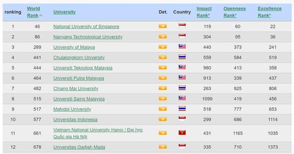 Vị trí xếp hạng của Đại học Quốc gia Hà Nội trên bảng xếp hạng Webometrics tháng 1/2023 trong khu vực Đông Nam Á.