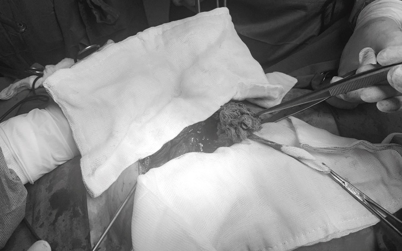 Khi mổ ổ bụng, bác sĩ thấy ở vị trí giữa rốn có khối áp xe kích thước 10×10 cm, bên trong là miếng gạc được các quai ruột non, mạc nối lớn bao bọc. Ekip tiến hành gỡ dị vật khỏi ổ áp xe, đặt dẫn lưu ổ bụng phòng ngừa tụ dịch, nguy cơ nhiễm trùng…