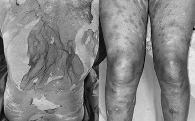 Khám lúc vào viện thấy dát đỏ thẫm, liên kết với nhau thành mảng, bọng nước, hoại tử da lan tỏa. Các niêm mạc không có thương tổn. Các xét nghiệm của bệnh nhân có hạ bạch cầu và tăng men gan.