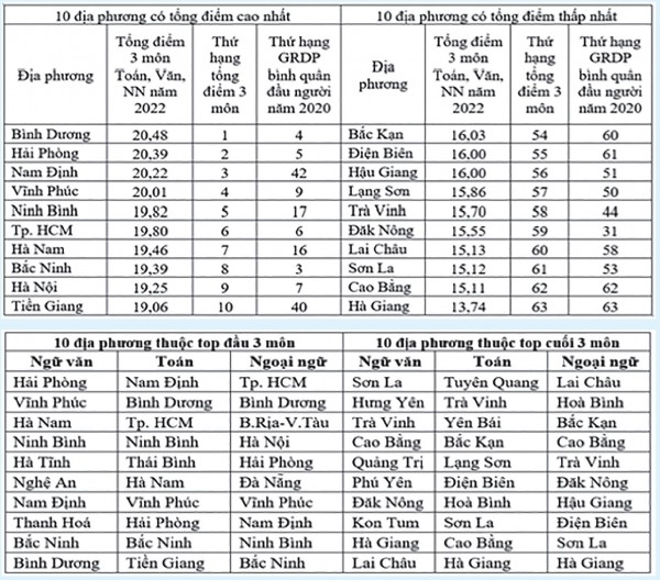 Trong 10 địa phương có tổng điểm 3 môn thấp nhất năm 2022 có 4 địa phương ở nhóm cuối cả 3 môn (Sơn La, Trà Vinh, Cao Bằng, Hà Giang), 5 địa phương ở nhóm cuối 2 môn (Đắk Nông, Lai Châu, Bắc Kạn, Điện Biên, Hòa Bình), 8 địa phương ở nhóm cuối 1 môn (Hưng Yên, Quảng Trị, Phú Yên, Kon Tum, Tuyên Quang, Yên Bái, Lạng Sơn và Hậu Giang). Qua kết quả đối sánh này, Nhà nước, chính quyền các địa phương cần có nhiều chính sách để hỗ trợ các địa phương khó khăn nâng cao chất lượng giáo dục nói chung và chất lượng 3 môn công cụ quan trọng này nói riêng.