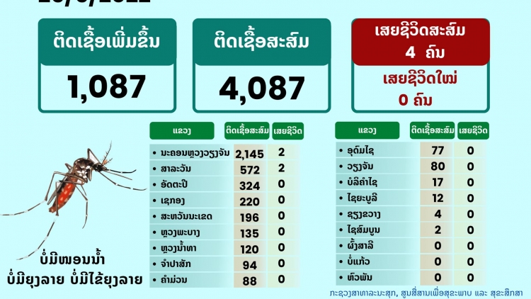 Theo Bộ Y tế Lào, mặc dù mới đầu mùa mưa nhưng dịch sốt xuất huyết ở nước này đang có chiều hướng tăng nhanh, khó kiểm soát. Bộ Y tế Lào cho biết, từ đầu năm đến nay, cả nước có hơn 4.000 người mắc bệnh, 4 trường hợp tử vong. Chỉ tính riêng Thủ đô Vientiane có hơn 2.100 ca mắc. Bà Sayphone Nanthaphone, Giám đốc Sở Y tế Thủ đô Vientiane cho biết, các ban ngành đang phối hợp và cùng nhau nỗi lực hơn nữa trong cuộc chiến chống lại bệnh sốt xuất huyết đang diễn ra ở hầu khắp các địa phương.