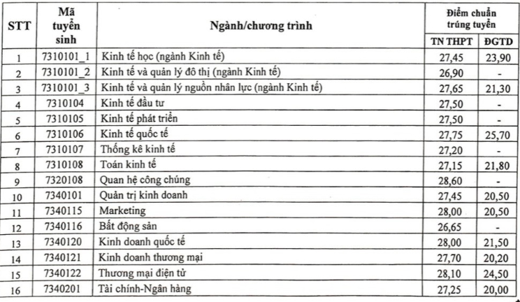 Cụ thể điểm chuẩn Trường ĐH Kinh tế quốc dân như sau: