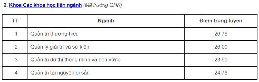 Điểm trúng tuyển là tổng điểm 3 môn thi/bài thi đối với thí sinh thuộc khu vực 3 (KV3), được làm tròn đến hai chữ số thập phân. Điểm tối thiểu cho mỗi môn thi/bài thi trong tổ hợp xét tuyển phải lớn hơn 1,0 điểm. Đối với các chương trình chất lượng cao, điểm ngoại ngữ tối thiểu đạt từ 6/10 trở lên (kết quả thi THPT).