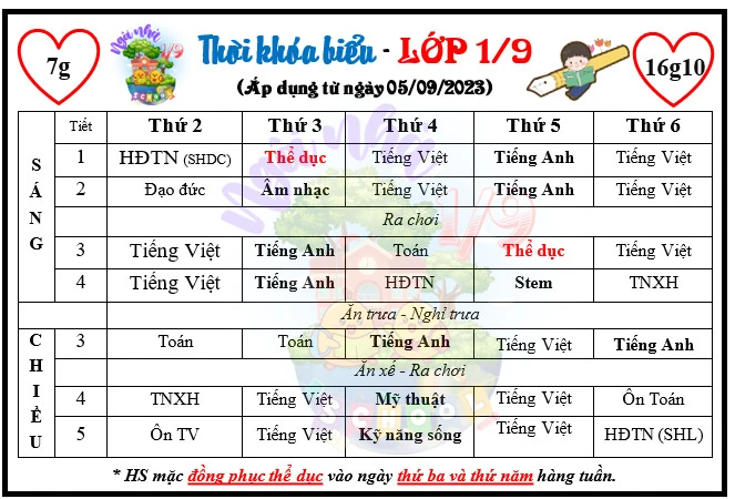 Thời khóa biểu của một lớp 1 có nhiều môn tự nguyện xen kẽ giữa các môn bắt buộc. Đến nay, thời khóa biểu này đã được điều chỉnh, thay đổi sau khi lấy ý kiến của phụ huynh học sinh