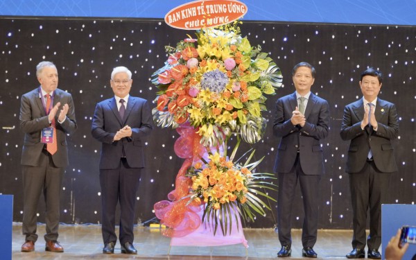 Trưởng ban Kinh tế T.Ư Trần Tuấn Anh (thứ 2 từ phải qua) tặng hoa chúc mừng diễn đàn |