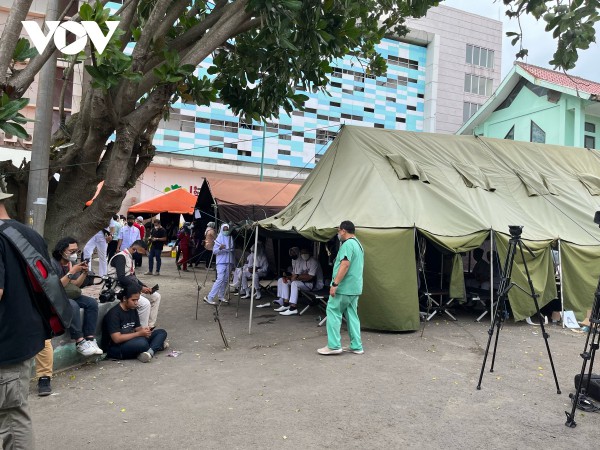 Lều bạt dã chiến được lập ngay tại sân bệnh viện.Bạn Fajriah Eshadrianti – sinh viên một trường cao đẳng cho biết: “Chúng tôi là sinh viên và được điều động đến đây để hỗ trợ các bệnh nhân. Từ hôm qua đến nay số lượng bệnh nhân đến rất đông. Chúng tôi phải sàng lọc ngay từ những lều dã chiến, bệnh nhân nặng sẽ chuyển lên tuyến chung. Đến hôm nay số lượng bệnh nhân bị thương chuyển đến vẫn rất đông”.
