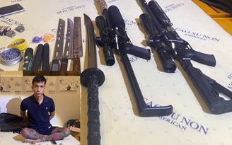 Lộc (ảnh nhỏ) cùng số vũ khí cất giấu tại cơ sở massage