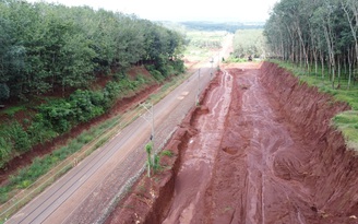 Tại đoạn tuyến từ Cầu Cứ đến điểm cuối (giao nhau với đường Đồng Phú – Bình Dương), PV Thanh Niên ghi nhận hình ảnh ngổn ngang vật liệu xây dựng 2 bên đường. Do địa hình một số đoạn tuyến qua đồi, dốc cao, đơn vị thi công đã hạ cốt nền, mở rộng diện tích 2 bên đường theo thiết kế. Điều này khiến hệ thống các trụ điện cao thế có nơi thì cao chót vót, có nơi thì nằm giữa đường, chưa di dời dẫn đến việc thi công bị ảnh hưởng. Nhiều phương tiện, máy móc được dựng 2 bên đường nhưng không hoạt động.