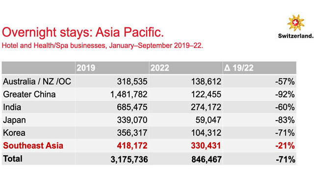 Trong chín tháng đầu năm nay, số lượng khách Đông Nam Á lưu trú qua đêm tại Thụy Sĩ đạt hơn 330.000 lượt khách, chỉ kém năm 2019 20%. Ngược lại, các thị trường châu Á chủ chốt khác lại giảm đáng kể, như thị trường Australia giảm 57% và đặc biệt là Trung Quốc giảm đến 92%. Ấn Độ, thị trường khách châu Á lớn thứ hai của Thụy Sĩ sau Trung Quốc, giảm 60%, Hàn Quốc 71% và Nhật Bản 83%.