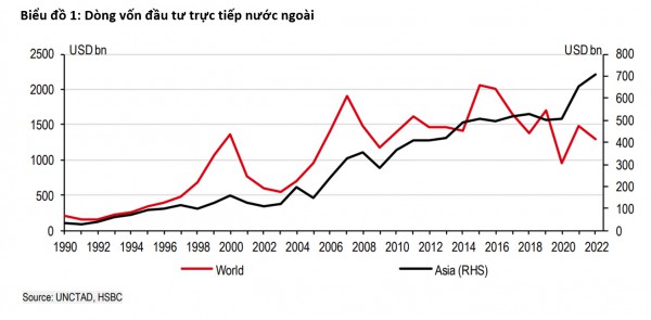 Biểu đồ đầu tiên cho thấy dòng vốn đầu tư trực tiếp từ nước ngoài vào Châu Á và trên toàn thế giới trong thời gian qua. Dòng vốn đầu tư trực tiếp từ nước ngoài vào các nước trên thế giới đã sụt giảm một thời gian sau khi đạt đỉnh vào năm 2015 như một phần của xu hướng “đảo ngược toàn cầu hóa” và “phân mảnh địa kinh tế”.